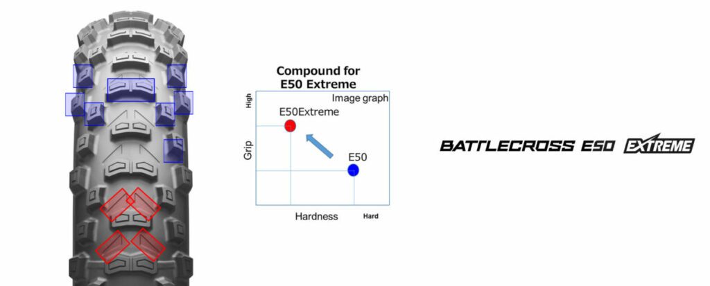 The new E50 Extreme challenges even the toughest terrain. It features a soft compound especially developed for superior grip and high traction power. The tread pattern incorporates advanced block positioning and works with the E50’s Castle Block technology to maximise edge effect and deliver extra traction.